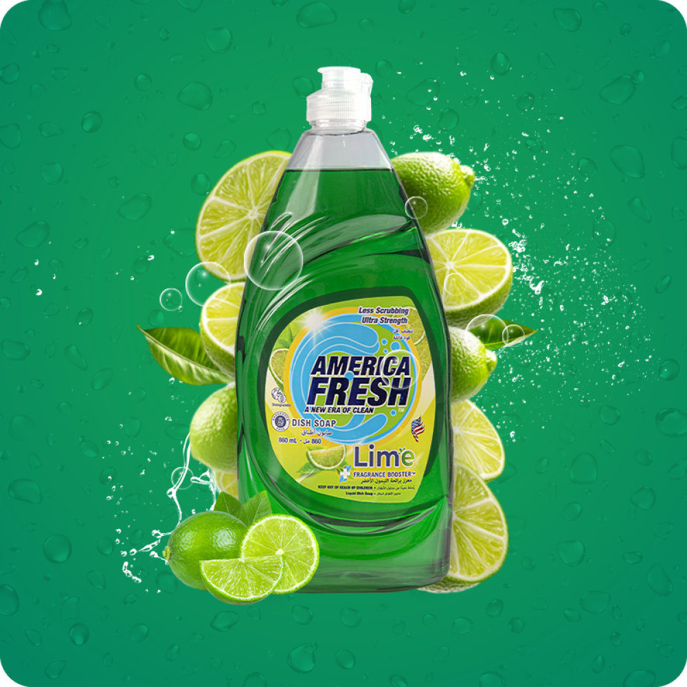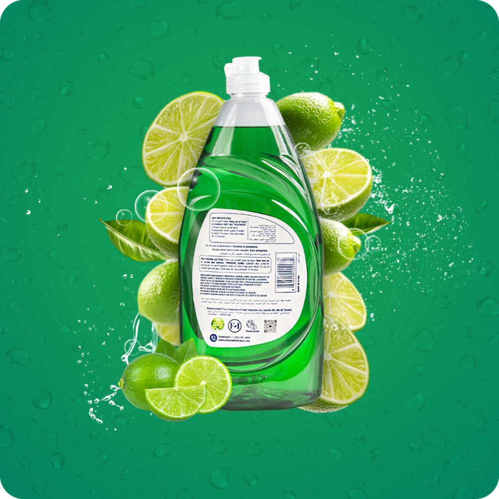 سائل جلي بقوة تنظيف عالية، يحتوي على خلاصة الليمون الأخضر لإزالة الدهون والزيوت من أول غسلة.