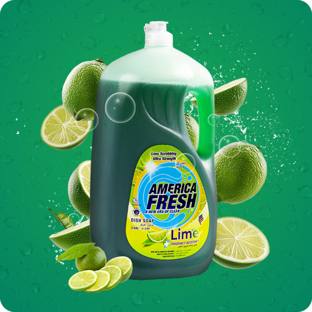 سائل جلي بقوة تنظيف عالية، يحتوي على خلاصة الليمون الأخضر لإزالة الدهون والزيوت من أول غسلة.